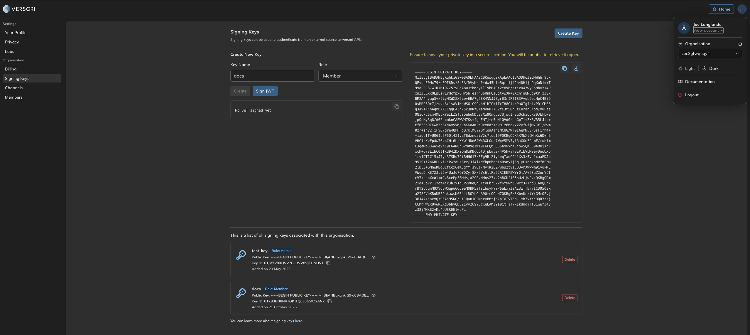 The first step is that you should generate a signing key for your organisation. These can be generated in the Signing keys section of the account settings page. To get there you can click on the My Account button and then on View Account. On key creation, you will be able to copy or download your private key as a.pem