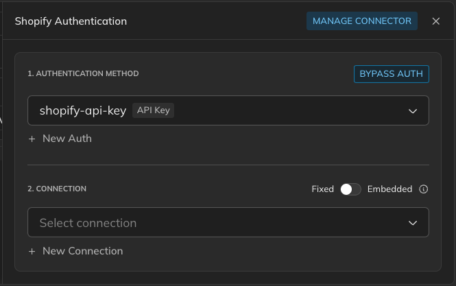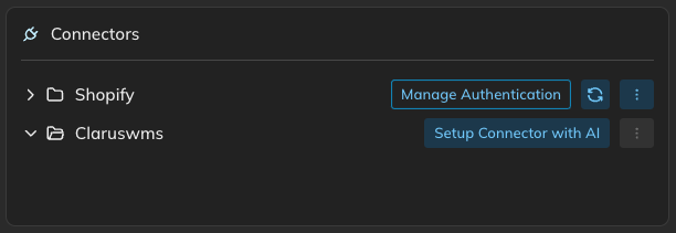 When new Connectors are created via AI, they start off unconfigured without endpoints or authentication methods. If an OpenAPI specification is provided, the configuration is automatically populated based on the specification. For unconfigured Connectors, click the “Setup Connector with AI” button to start the process to automatically configure the Connector, this can take a couple of minutes to complete. Once complete, selecting “Manage Authentication” will open the Authentication sidebar where you can see what the AI has configured, make any adjustments, and create a Connection for the Connector.