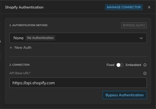 To bypass authentication for a Connection, select the “Bypass Auth” option. This creates a new Authentication Method for the Connection called “None” with type “No Authentication” and the Connection section updates to allow you to configure the base URL for the Connection, and a confirmation button to “Bypass Connection”.