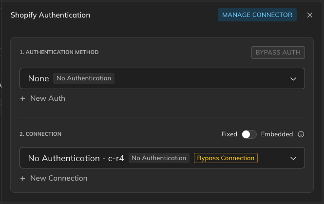 Once confirmed, a new Connection will be created and the Connection dropdown will indicate that the Connection is using bypassed auth.
